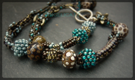 ich hab noch so viele Lampworks, die sind sicherlich jetzt so acht , neun Jahre her. Und zu schade zum rumliegen. Und jetzt habe ich die mit den tschechischen Hybriden in Braun und ganz viel Inspiration von meinem Lieblingsbuch Bead Play Love zu einer kleinen, feinen Kette gefädelt.