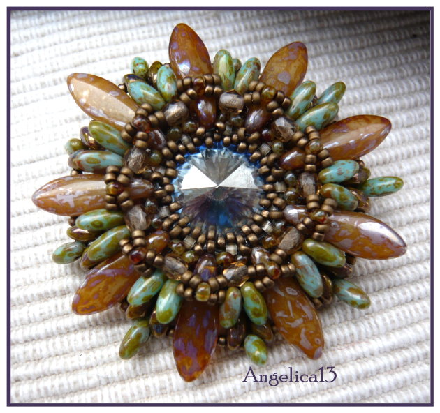 -drei RAWvarianten und einmal Ladderstitch, das ist es so im Groben. In gelbgrün und mattbraun. Auch so grob geschrieben... Einmal RAW belegt, das wurde aber sehr fein, dann eine alte Technik aus CubicRAW, das sich selber dreht und dann war es nur noch ein kleiner Schritt zum flachen RAW , das sich ebenfalls dreht. Da passte dann ein Farnblatt dazu, dieses hier ist dem Lariat von Melissa Grakowski nachempfunden.. Und ready.