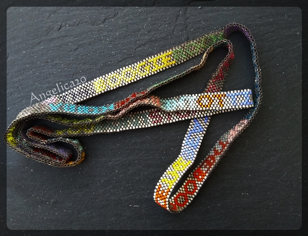 Bei Pinterest habe ich mal eines von diesen Kreuzstichstickbildern gesehen, die mit den Namen der Kindern im Flur hängen. Nur halt mit dem Text von Rappers Delight. Ich war schockverliebt. Ich kann zwar Sticken , aber genau wie Stricken gehört das Sticken nicht zu meinen liebsten Beschäftigungen. Aber dann hatte ich die Idee ein langes Peyoteband zu machen, endlos. Zwar eine Quatsch-Spielerei, aber wir hatten ja Zeit dieses Jahr.
