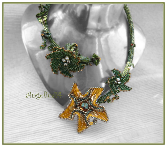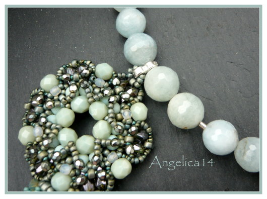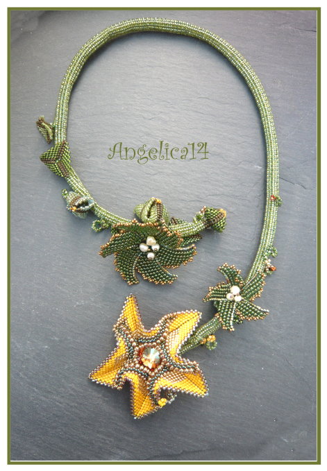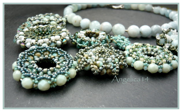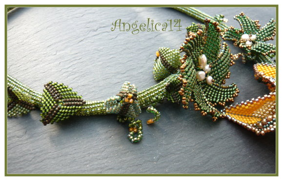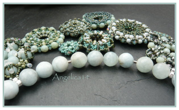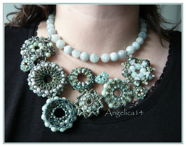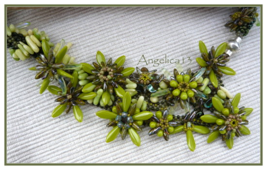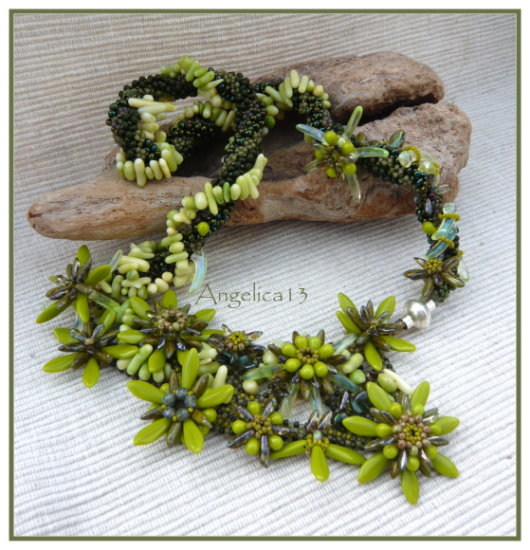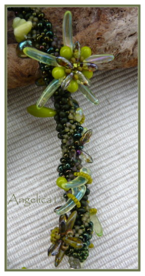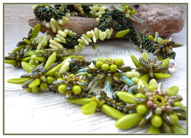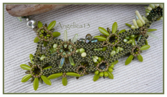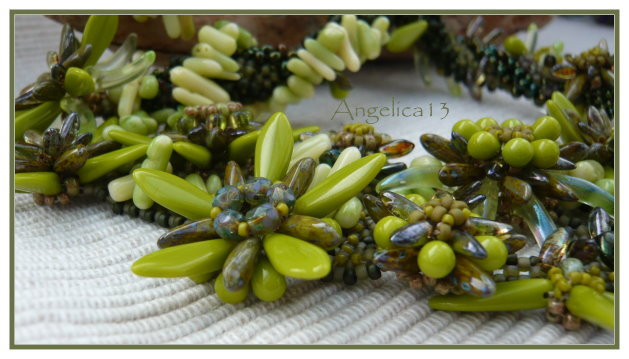 aus gegebenen Anlass hab ich mich durchgerungen und endlich die Lekku gefädelt. In 650 und 991, mit Swaros in Khaki und Lime im Verhältnis 1:2 und grün-schwarz gestreiften Drops. Ein wenig enttäuscht bin ich vom Gewicht, 141 Gramm , da hab ich mehr erwartet. Sie trägt sich wie nichts, man merkt sie nicht...