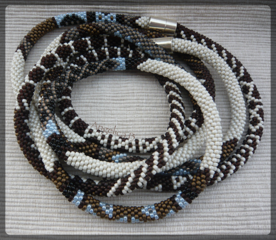 ausnahmsweise hab ich mich mal an die Vorgaben von Judith Bertoglio gehalten, also was die Länge und die Perlensorte angeht. Bei so einem etnischen Muster passen 8er auch, aber ich kehre sonst gerne wieder zu Treasures, 11er und 15er zurück, oder Triangel, oder Hexen… Toho in beige, schwarz, Miyukis in Lieblingsgrau und braun und einem babyblau gelüstert