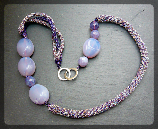 ich hatte ja bereits eine Minipicot gehäkelt. Beim Schlichtreffen meinte dann Inge, in 15er sieht das sicher auch süss aus. Also hab ich nochmal angefangen, als 15er. In Fliedertönen. Aber nur so war sie mir zu dünn und zu häkelig, deshalb wurde mit dünneren Strängen ergänzt. Und die opaligen Glasnuggets und Facetten waren 2005 mal für eine GrünLila Kette vorgesehen, die zum Ufo mutierte, deshalb bewege ich mich passend zum aktuellen Trend und re-use mal ein paar Perlen.