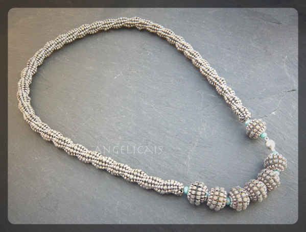 letztens sass ich so da und dachte, mach doch mal „alte Anleitungen „, Hera, Astra, die ganzen netten Beaded Beads von vor 16, 18 Jahren. Also fing ich an mit einem Schwung Astras in grauen Tönen. Sah gut aus und sollte dann ne Kugelkette werden mit ähnlichen Mustern.