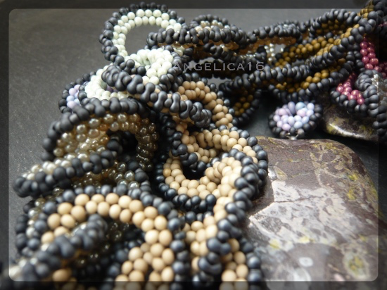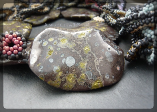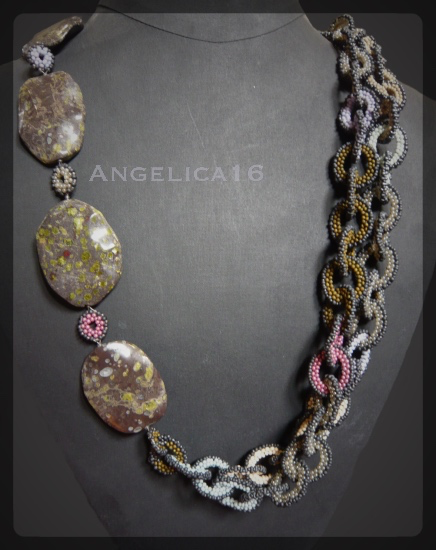 Lange gemacht, irgendwann fertig. Die Jaspissteine wurden vor drölf Jahren auf der Weltschönsten Mineralienbörse im Elsass gekauft, jetzt dann endlich die richtige Idee. Die Farben passten prima zu den sowieso sehr schönen FarfalleBeads von Matsuno.
