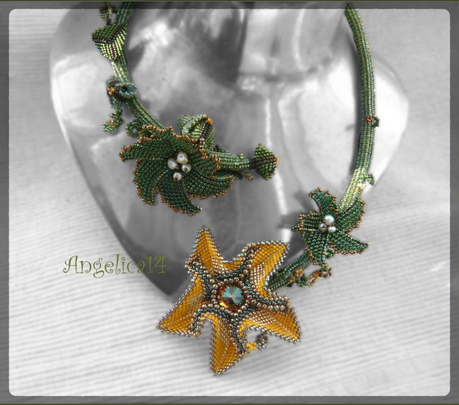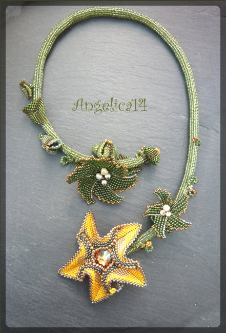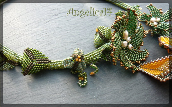 Und dann hab ich die Desert Rose gefädelt und irgendwie fand dann alles zusammen. eine Freundin von mir, hatte bei unserem JourFixe die Idee, ein paar Dreiecke zu Knospen zusammen zu fädeln, war eine gute Idee. In der Kette sind Matsunos aus den USA und Toho 617, 37f, 702 und noch was undefinierbares in schlüpferrosa/hellgrün. Die Blüten sind 333 und eine Delica, die ich nicht kenne. Und die Eridhanblüte ist aus Toho 825 und 22, dazu 84 und Miyuki 311. Und nu bin ich einige Perlen los und ne Kette reicher.