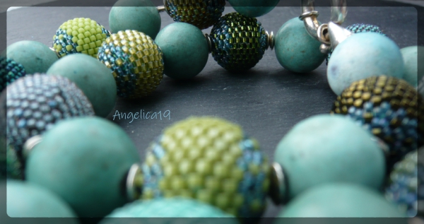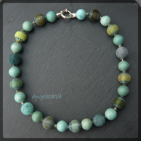 bei einem Perlentreffen sah ich eine Kette aus lauter Cyrenes. Und da fiel mir ein, das ich auch noch ne Handvoll von denen auf Lager liegen hatte. Ein paar schlichte Peyotekugeln ergänzt, ein paar Türkise, ein SterlingSilberSchloss, fertig.