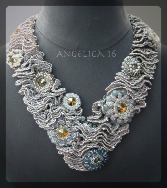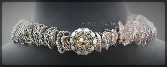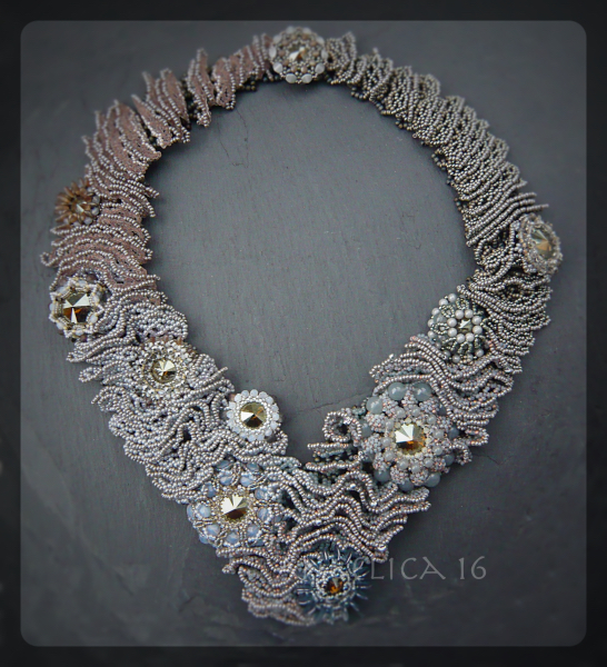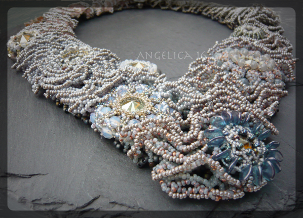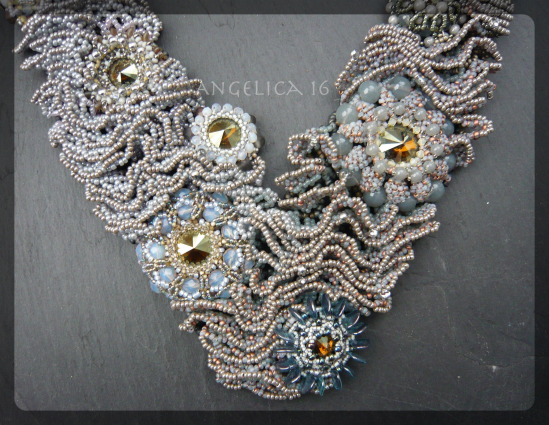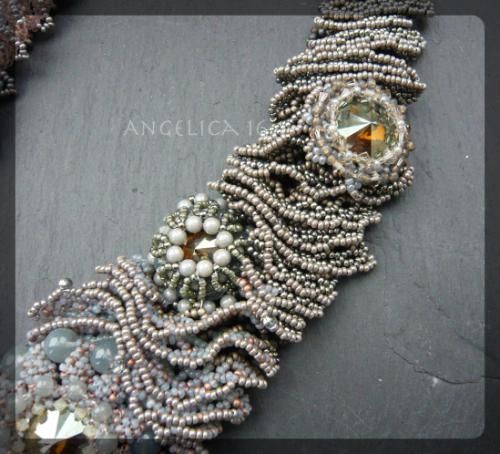 Eine Netzbasis, darauf verschiedenste Rivolifassungen, teilweise noch aus Illes aux perles Zeiten. In kittgrau, braungrau, blaugrau, grüngrau, graugrau usw. Die habe ich in einem Farbverlauf auf das Netz genäht und dann nach der Idee von Rachel Nelson Smith mit Netz belegt. Und das Netz hat auch jeweils drei Farben, kittgrau, braungrau, graugrau…………..