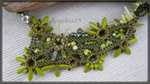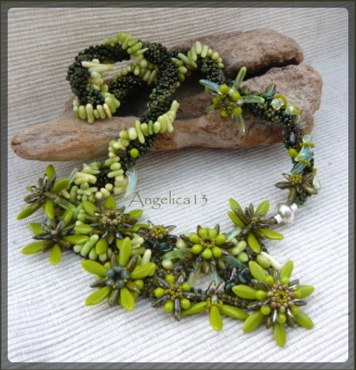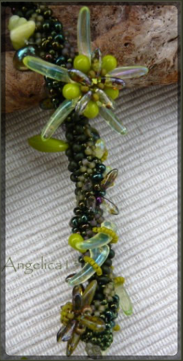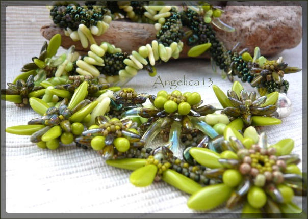 eine wirklich schwere Geburt, da musste ich mich zwingen, über Monate immer wieder mal etwas. Solche Ketten haben kein Konzept sondern nur eine leichte Ahnung und entstehen während der Montage. Freeform habe ich alle Haya Shuriken Blüten mit RAWbändern verbunden, eine alte Kette aus Netz/RAW mit Magatamas wurde auch mit eingearbeitet und endlich konnte ich die Korallenstränge verarbeiten, die ich schon seit mehreren jahren hier liegen habe. Und nun ist sie fertig. Alle Dagger von Beadlibitum, dazu ein paar Vintage Uranglaszähnchen und Perlen von Toho.