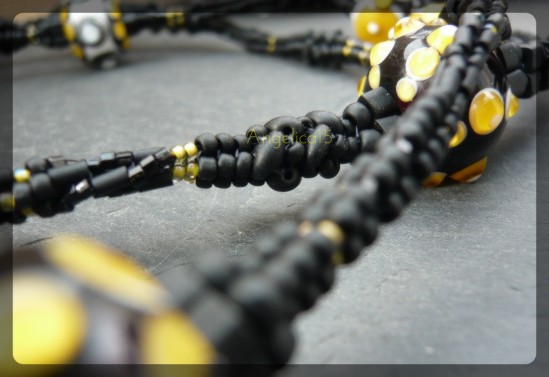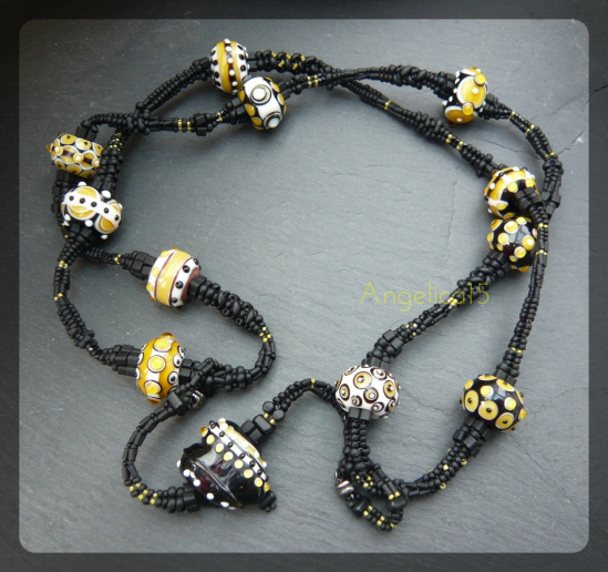 Die Lampworks besitze ich seit gut 2009. Und Herringbone ist meine liebste Technik, deshalb also dieser Versuch. Beim Fädeln musste ich immer an eine nächtliche Skyline denken, so gegen 4 Uhr im Herbst, wenn nur noch wenige Fenster erleuchtet sind.