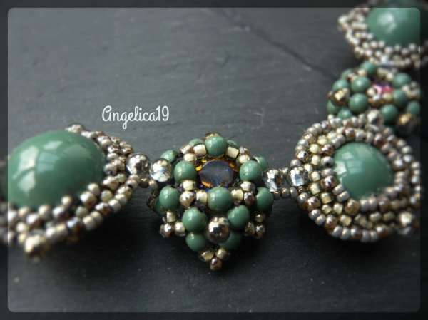 Und da ich diese runden Perlen in Hartford Green dazu verwendet hab, dachte ich, das wäre eine klasse Idee, die passenden Domebeads zu verwenden, dann sind die endlich weg. Das war ein Fehlkauf, das einzig Schöne ist die Farbe. Bei der Gelegenheit hab ich festgestellt, das es die Dinger in zwei Größen gibt, das war mir bis dahin nicht aufgefallen. .